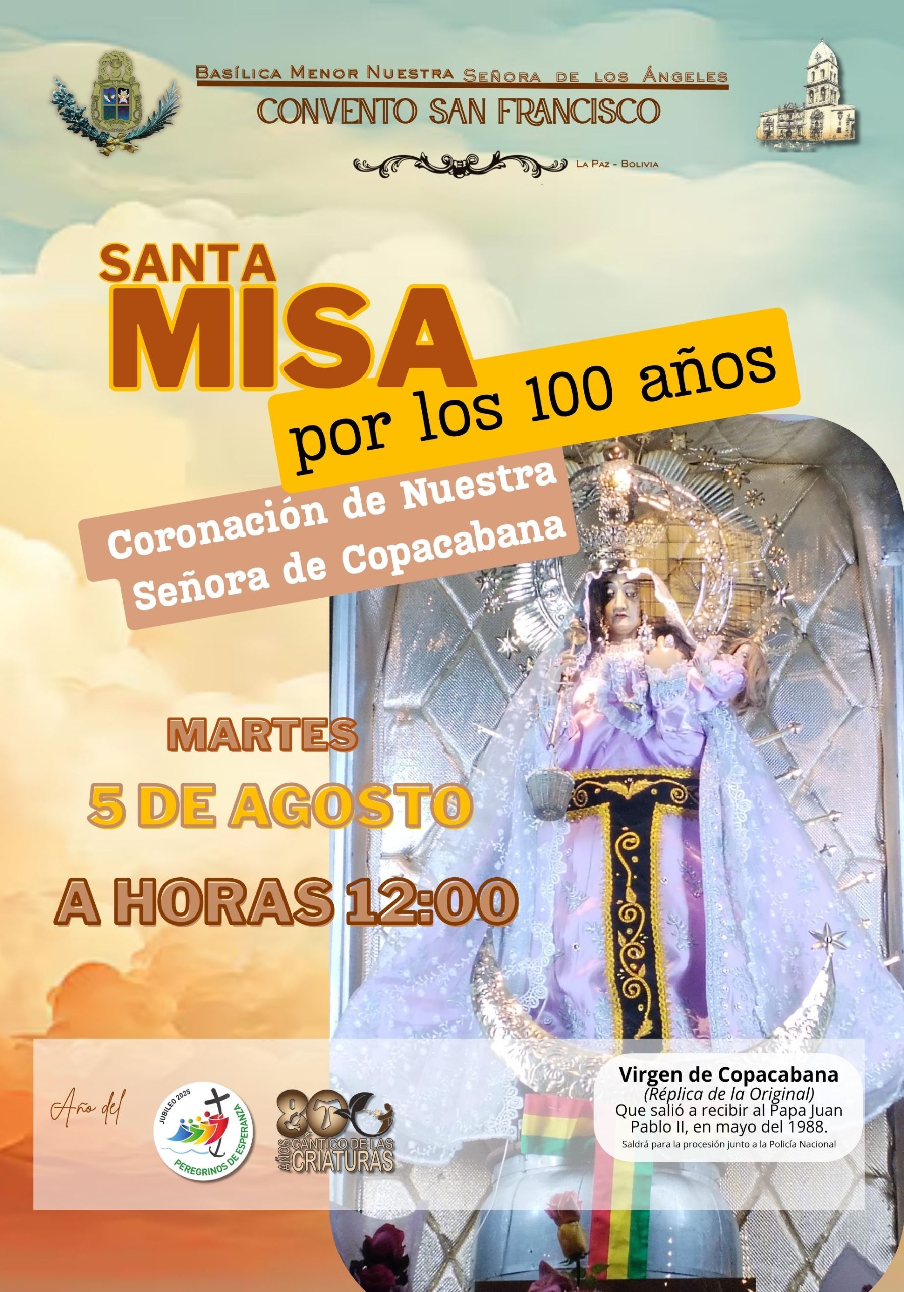 Hace un siglo, el corazón creyente del pueblo boliviano coronó a Nuestra Señora de Copacabana como Emperatriz, Reina de Bolivia, Patrona y Generala de la Policía Nacional. Hoy, en el marco del Año del Jubileo de la Esperanza 2025 y del VIII Centenario del Cántico de las Criaturas, la comunidad franciscana te invita a renovar tu fe y devoción mariana participando en esta significativa celebración.